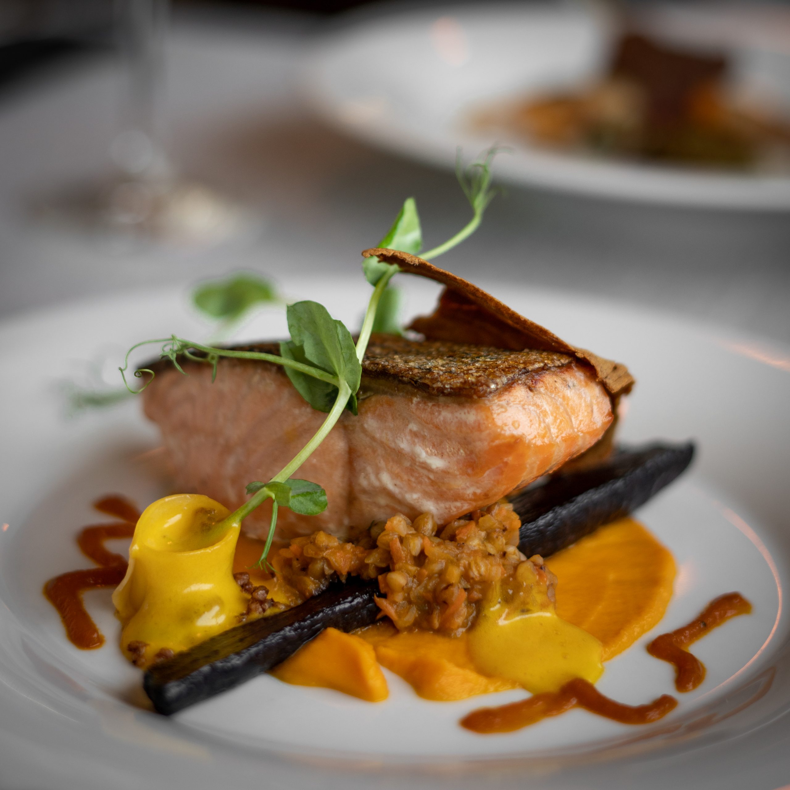 Pääruoissa asiakkaamme voivat valita kolmesta harkiten suunnitellusta vaihtoehdosta. Paistettu kotimainen taimen on yhdistetty makeaan porkkanaan ja klassiseen Hollandaise-kastikkeeseen, luoden harmonisen ja tyylikkään annoksen. Toisena vaihtoehtona on pitkään haudutettua naudan poskea, joka tarjoillaan syksyisen kurpitsan ja täyteläisen punaviinikastikkeen kera – täydellinen valinta lihaa arvostavalle isälle.